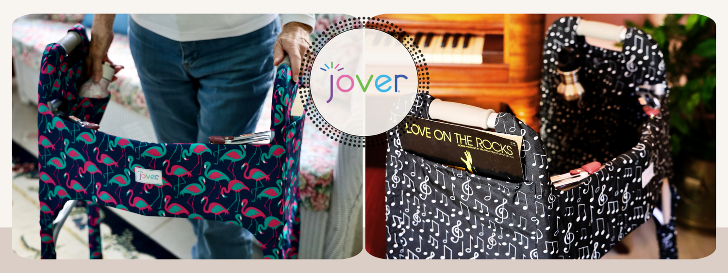 The Jover Walker Cover is a fabric cover that fits onto standard folding walkers to add personal style and convenient pockets, without changing how the walker works.